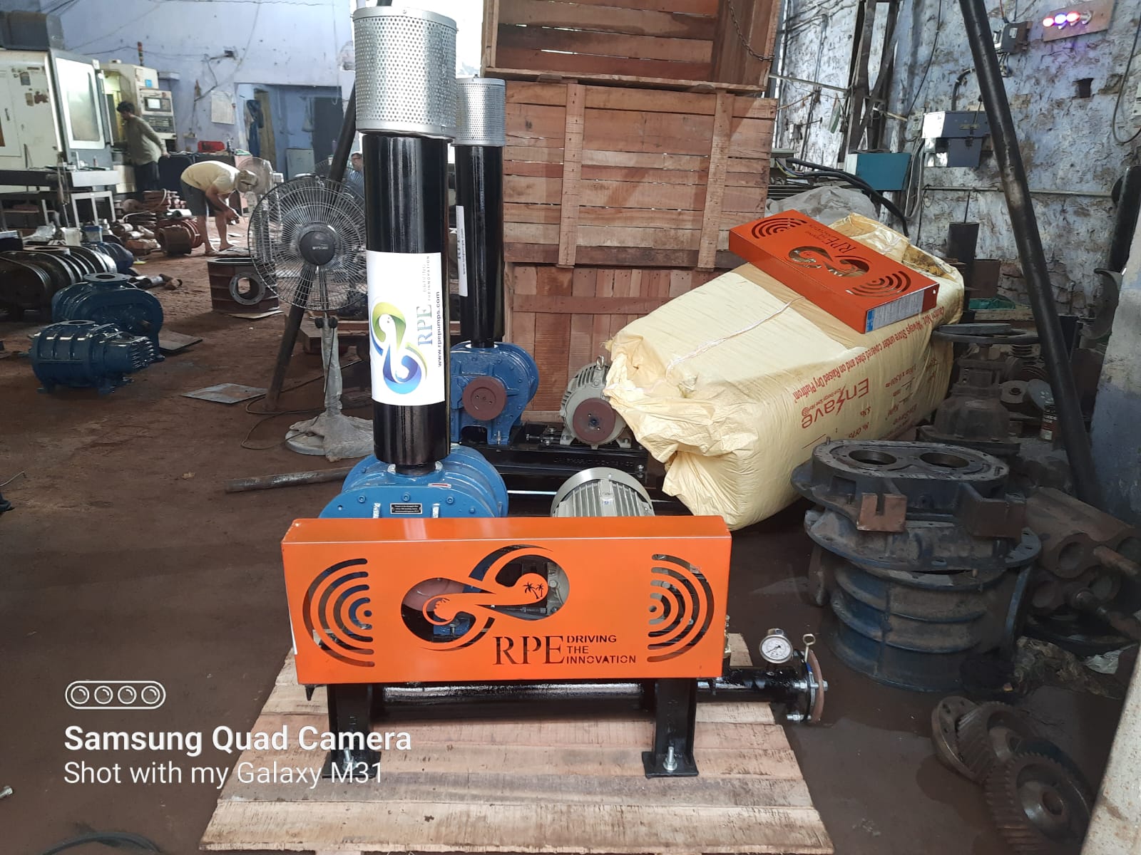 RPE make Twin Lobe Roots Blowers are used in STP/ETP Plant for aeration purpose Capacity Ranges from 50CMH to 150CMH upto maximum diffrential pressure of 0.5kg/cm2 As each rotor passes the blower inlet, it traps a definite volume of air/gas and carries it around the casing all the way to the blower’s outlet. With constant speed operation, the displaced volume remains approximately the same at different inlet temperatures, inlet pressures, and discharge pressures. As each rotor passes the blower outlet the air is compressed to the system pressure there and expelled. There exist finite clearances between every part inside the casing of the blower, which allows operation without lubrication being required inside the casing, and hence the blower provides 100% oil-free air at the discharge end. Timing gears control the relative position of the rotors to each other.